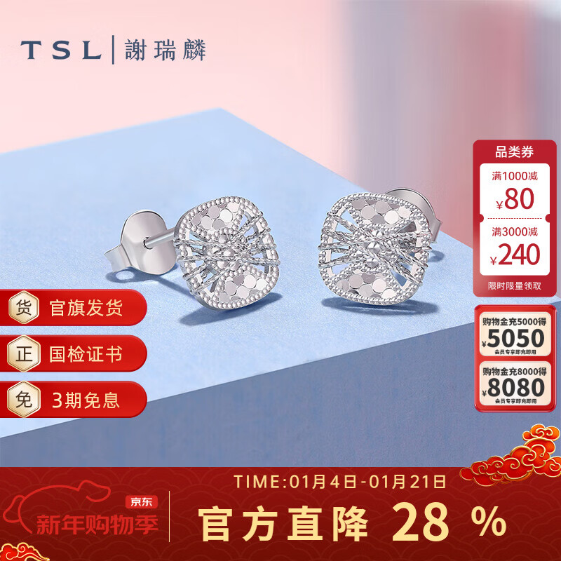 谢瑞麟(TSL)新年礼物铂金耳钉方形简约Pt铂金耳环女士耳饰BF443 一对(约2.0g)