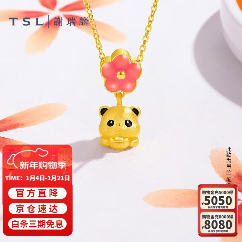 谢瑞麟(TSL)新年礼物富足熊猫系列熊猫桃花黄金吊坠5D硬金工艺不含链XQ385
