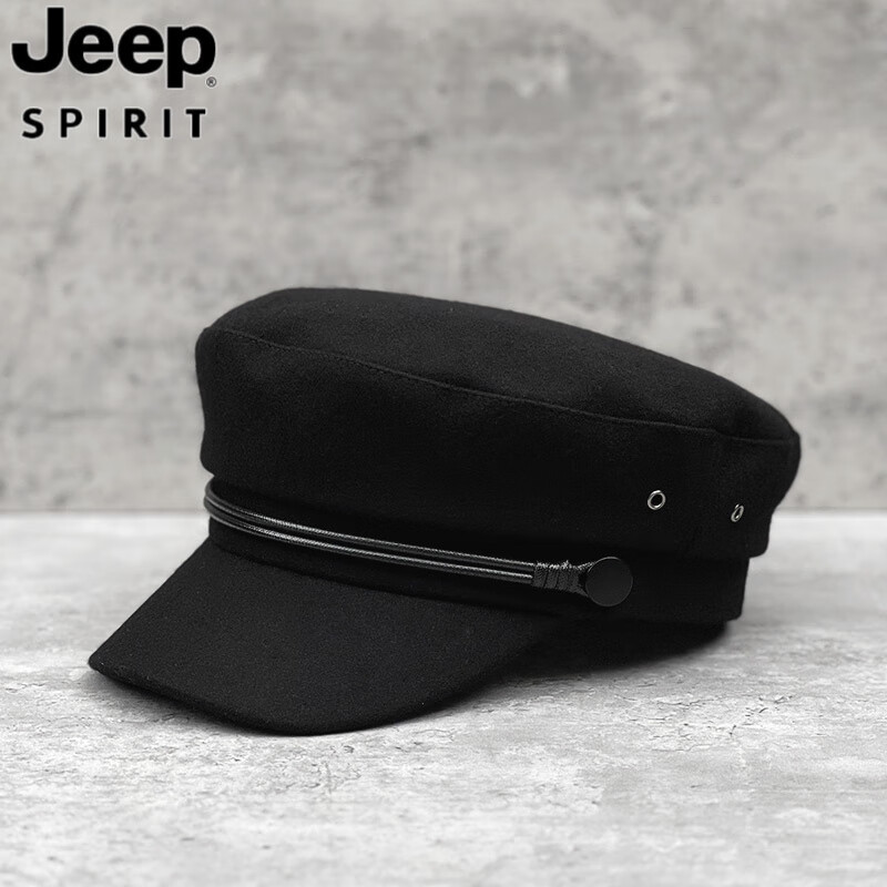 JEEP SPIRIT日系复古贝雷帽男女平顶帽秋冬粗蜡绳气质版报童帽鸭舌画家帽 黑色+透气眼 粗蜡绳全毛呢平顶 XS 加小号54CM头很小或儿童选