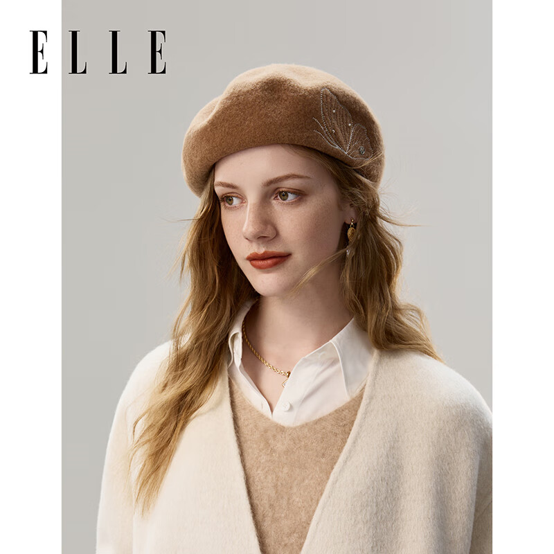 ELLE100%绵羊毛贝雷帽女秋冬季时尚百搭蝴蝶刺绣蓓蕾画家帽显脸小