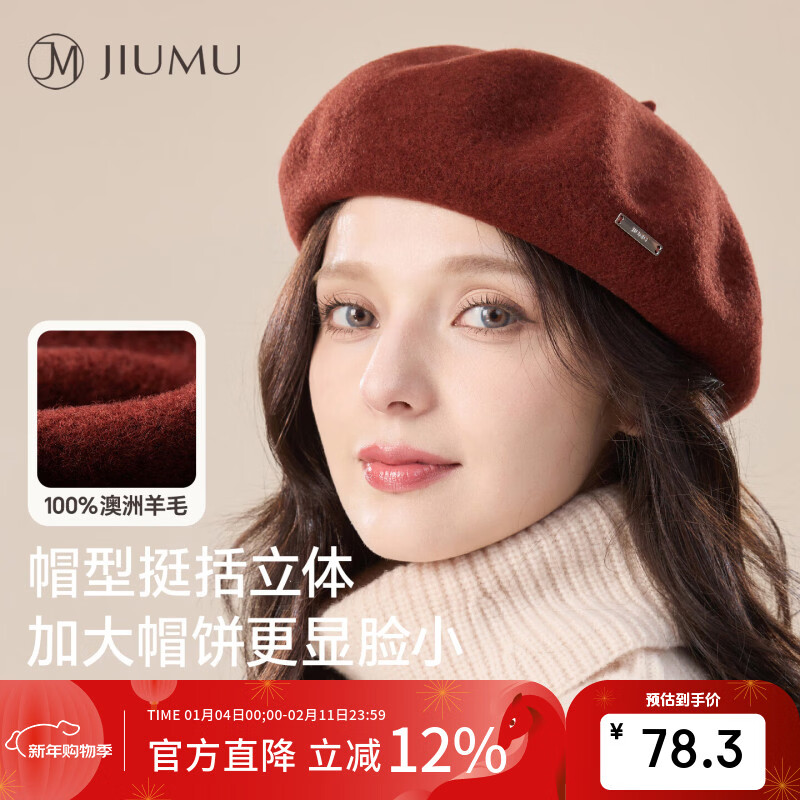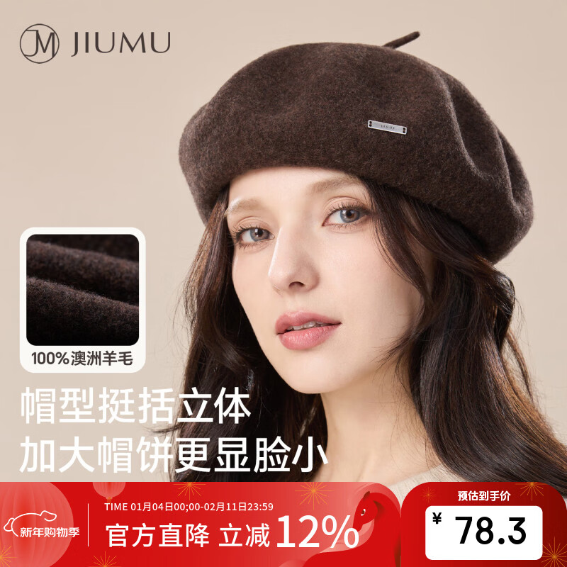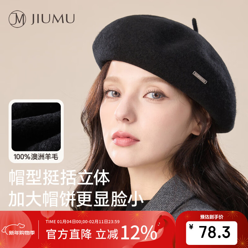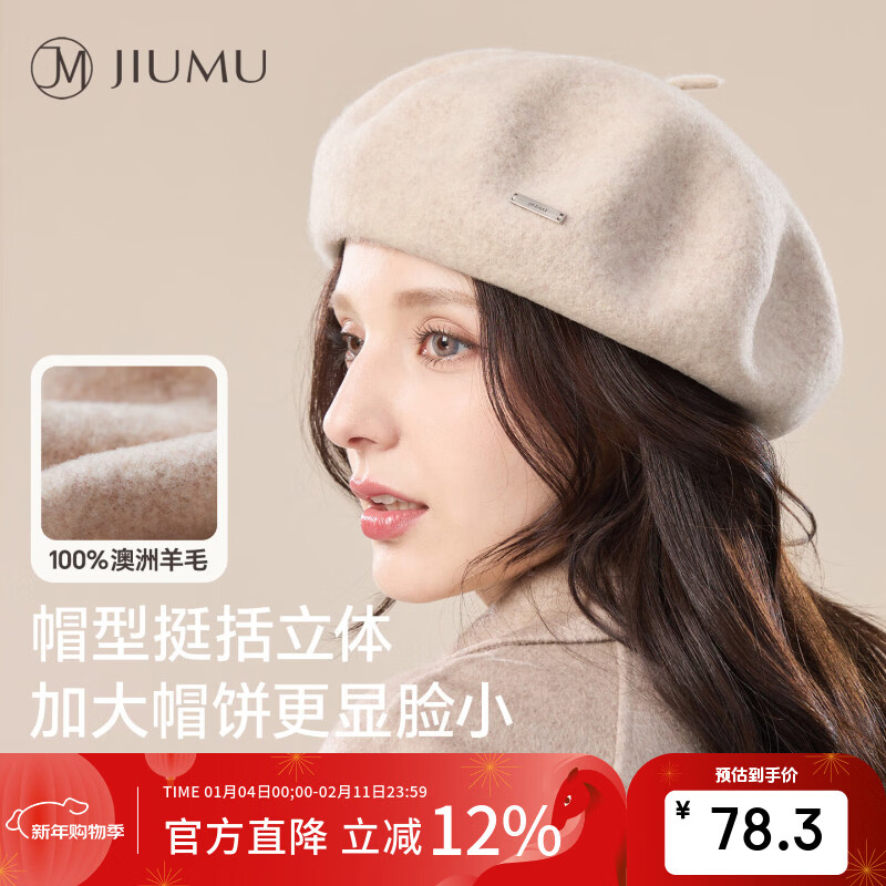 玖慕(JIUMU)纯羊毛贝雷帽秋冬季保暖毛呢画家帽日系英伦复古经典百搭帽子女