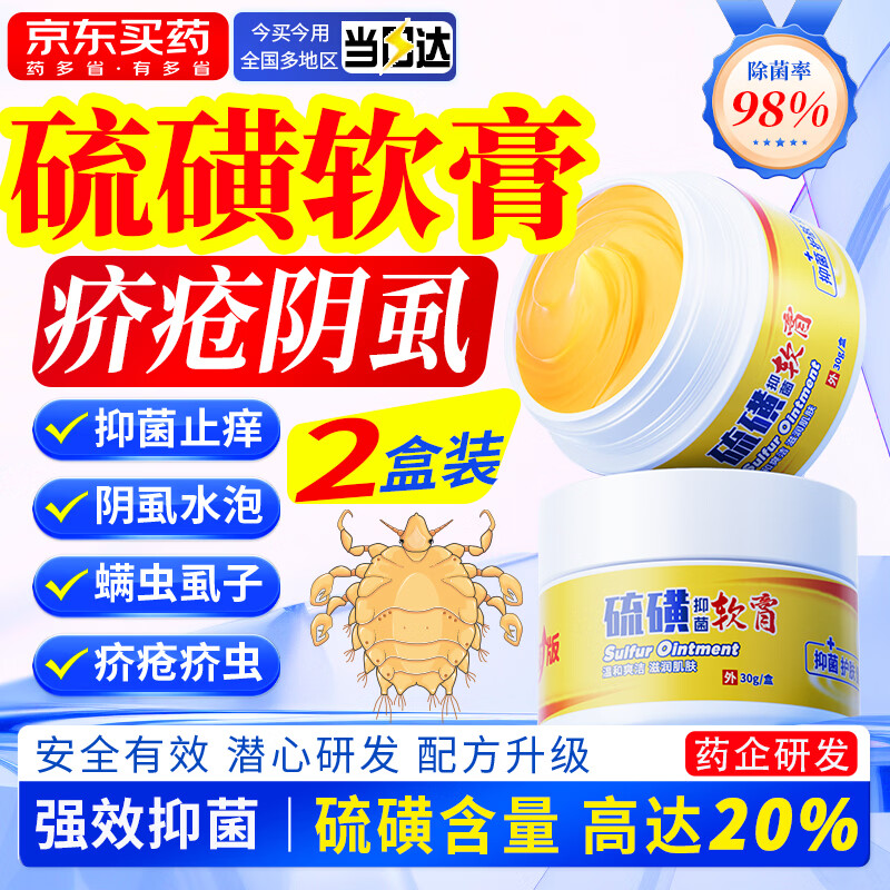 寓福堂硫磺软膏阴虱男女私处阴囊潮湿瘙痒皮肤瘙痒疥疮虫螨虫疹乳膏20% 2盒装60g