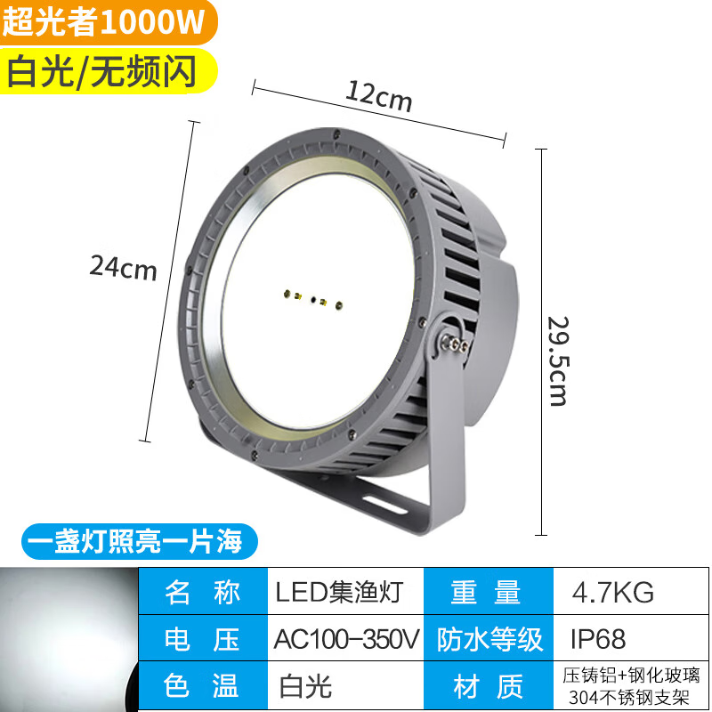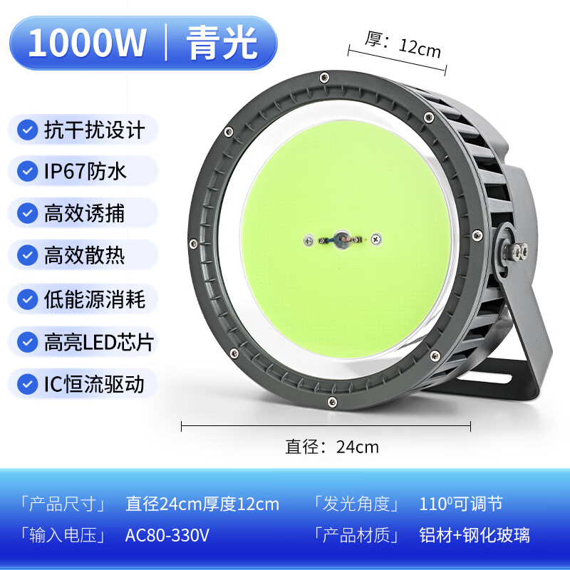 双幼渔船LED集鱼灯高功率1200W户外夜钓捕鱼诱鱼探照鱿鱼灯海钓专用灯 1000W青光(防干扰+无频闪) 保5年