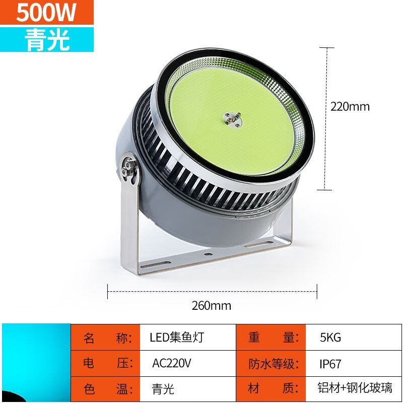 诱鱼灯聚鱼灯LED集鱼灯鱿鱼灯船用海钓筏钓灯户外防水船用大功率 黑色款鱼灯-500W青光【220V】