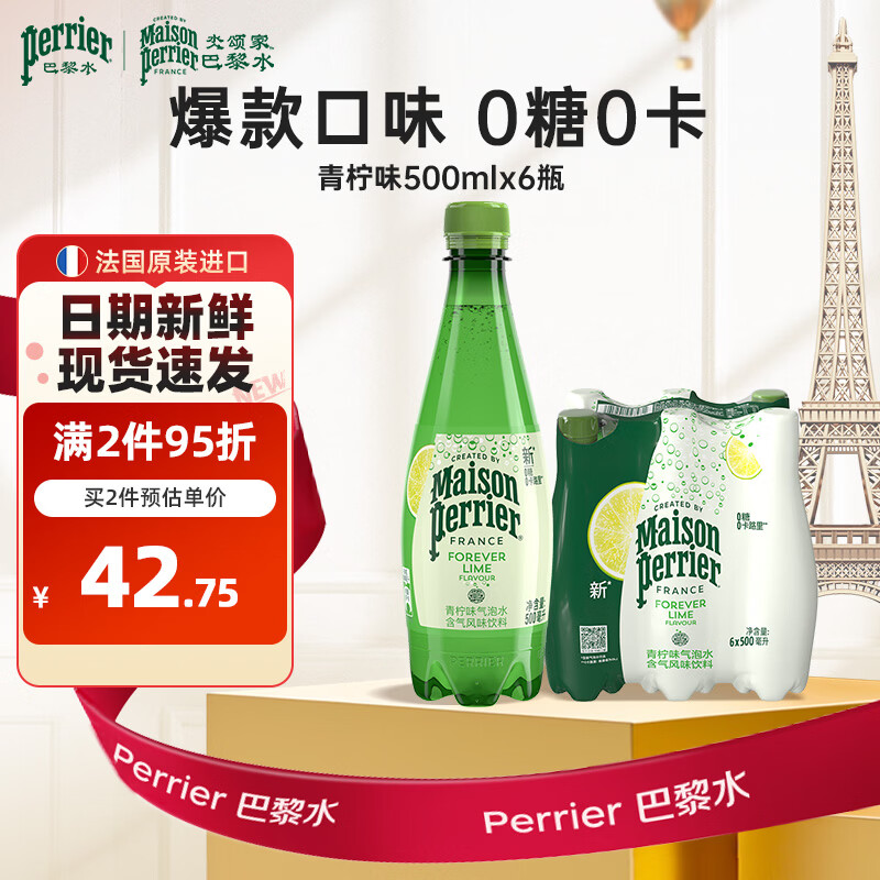 Perrier氼颂家巴黎水 进口气泡水 0糖0卡0脂 青柠味矿泉水500ml*6瓶