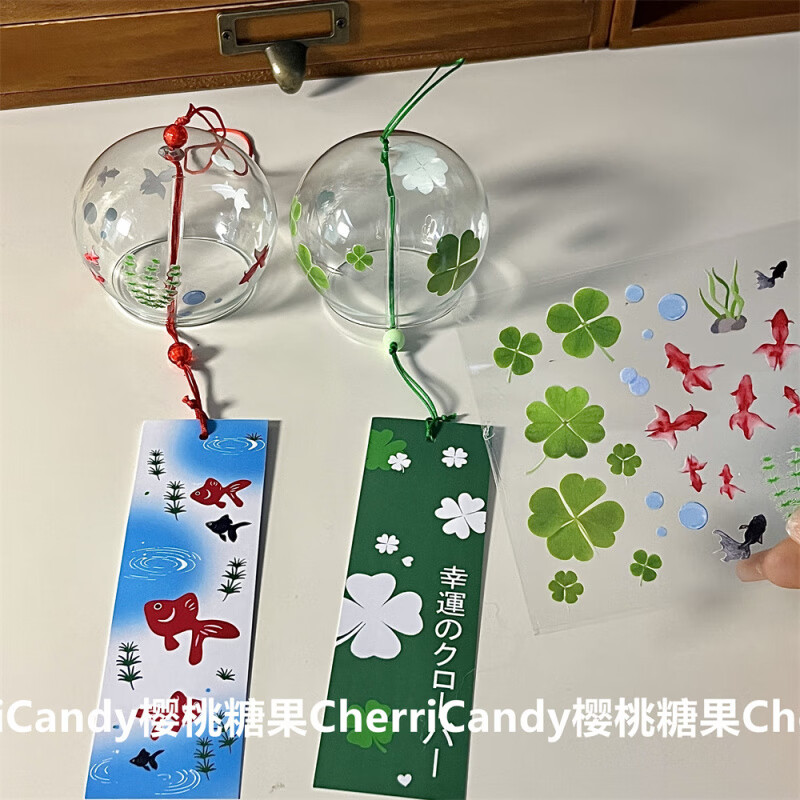 昭和风复古挂饰房间古早味装饰金鱼风铃玻璃幸运四叶草风铃 玻璃风铃[绿绳四叶草挂牌+转印贴
