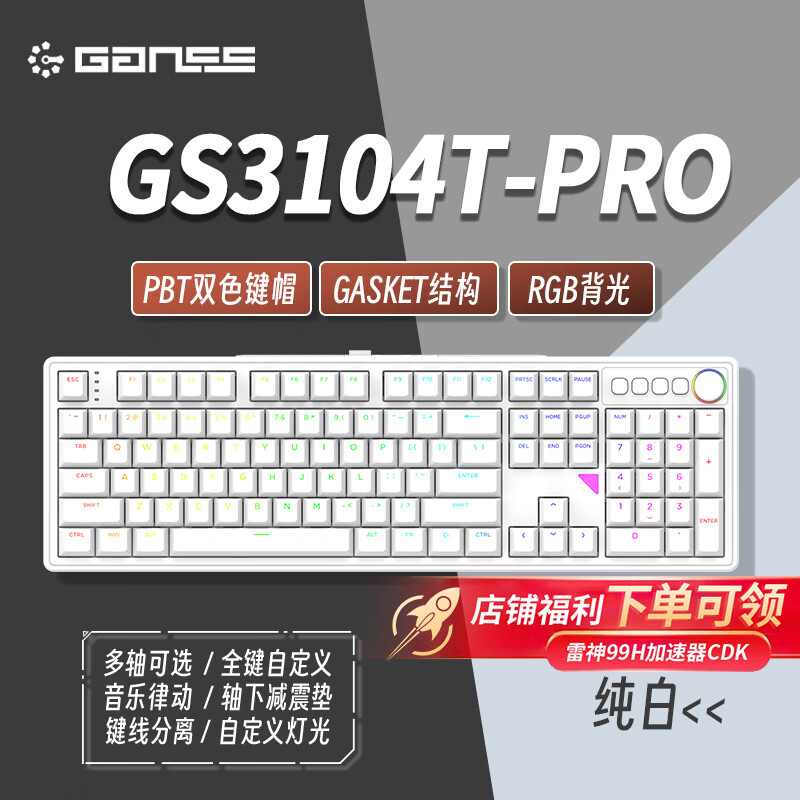 GANSS 3087TPro/3104TPro/3108TPro客制化机械键盘高斯三模RGB无线键盘蓝牙2.4G有线热插拔办公游戏键盘 3104TPro白色【GASKET结构】三模RGB KTT静音红轴