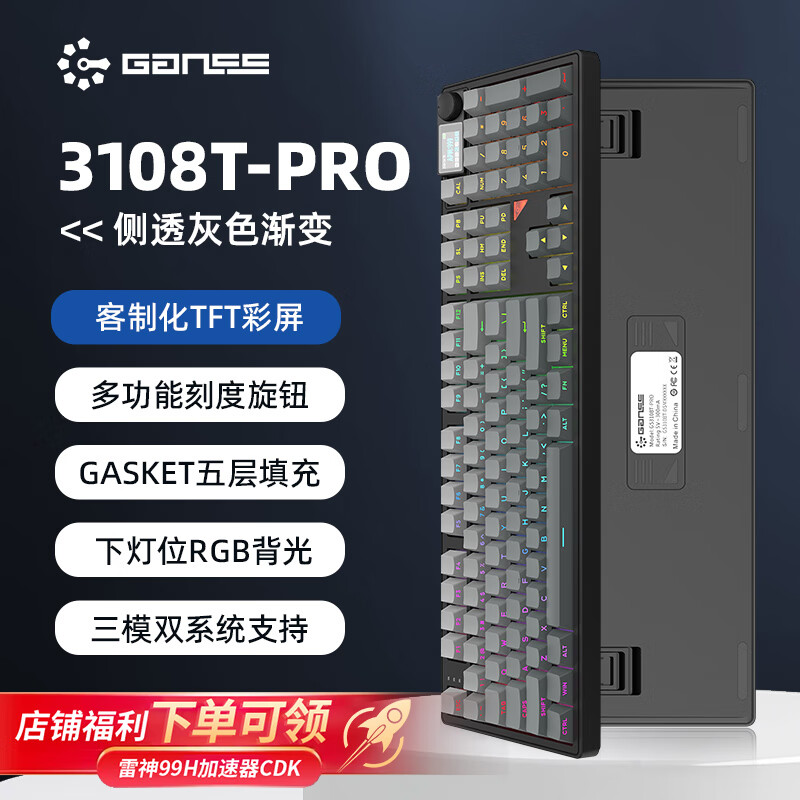 HELLO GANSSGS3108TPro客制化高斯机械键盘 有线蓝牙三模连接 Gasket结构 108键盘 办公 GS3108TPRO 【侧透灰色键帽】 KTT静音茶轴(茶轴静音版)