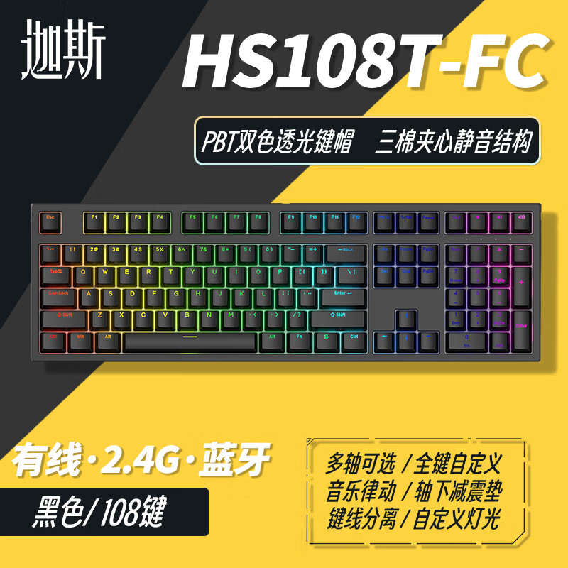 HELLO GANSS 有线 蓝牙2.4G无线三模 RGB插拔轴游戏电竞办公高斯机械键盘 HS108T-FC三模 纯黑GANSS黄轴