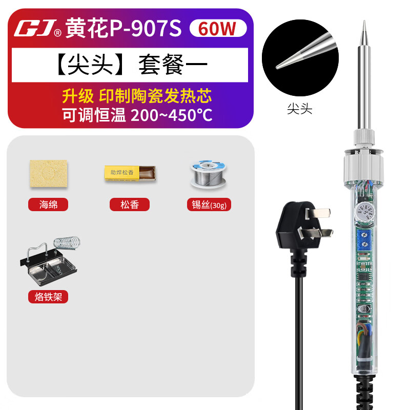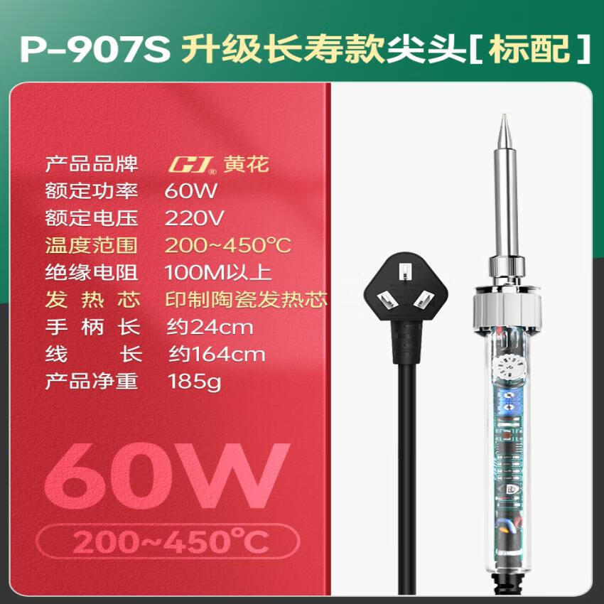 高洁广州黄花电络铁30W40W 60W锡焊电烙铁焊接工具电铬铁电子维修洛铁 GJ907S尖头(恒温内热60W)