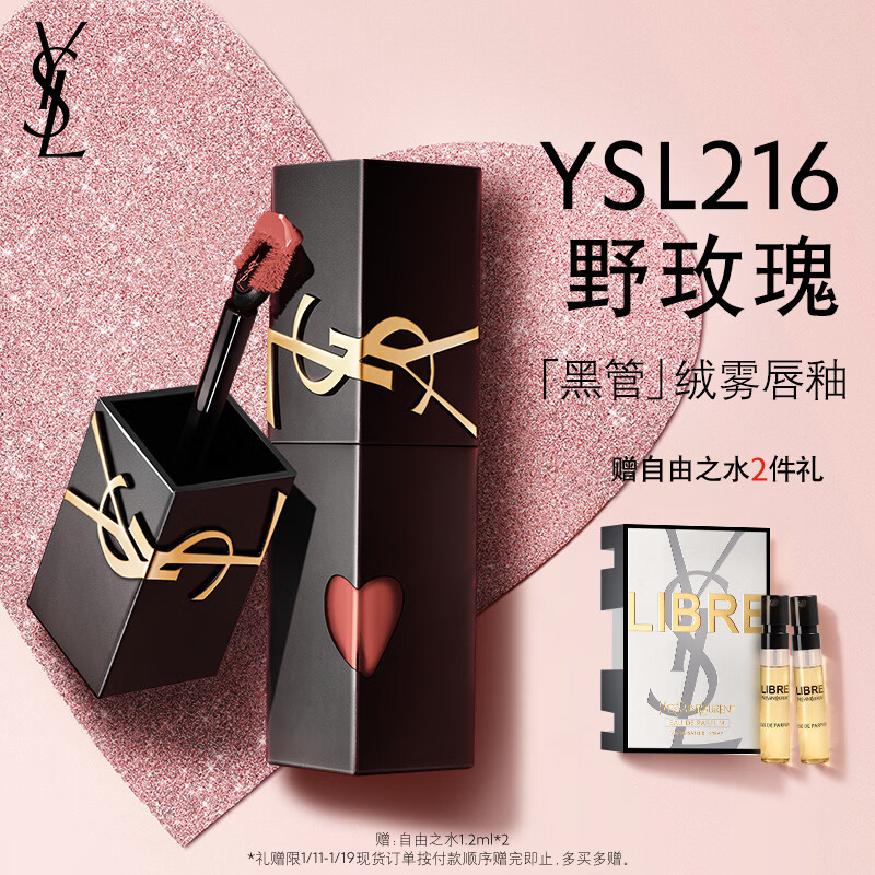 YSL圣罗兰黑管哑光爱心唇釉216雾面口红化妆品生日礼物送女友新年礼物