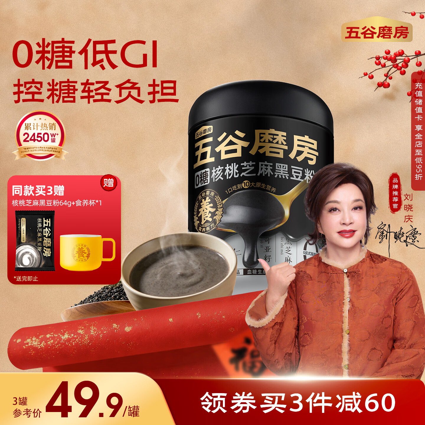 五谷磨房低GI黑芝麻糊炖奶米糊无糖核桃芝麻黑豆粉即食早餐代餐粉546g*2罐