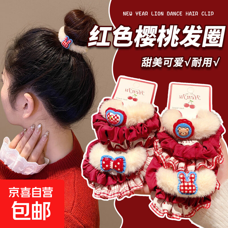 2026新年红色毛绒蝴蝶结花边发圈女童手工小兔儿童喜庆氛围感头饰 2#小兔大肠发圈3件套