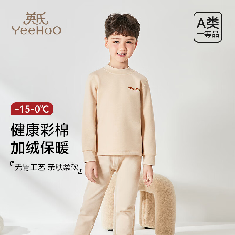 英氏(YEEHOO)儿童保暖内衣【天然有机彩棉】加绒加厚秋冬A类秋衣秋裤睡衣套装 450g深冬-男童纯色款 150