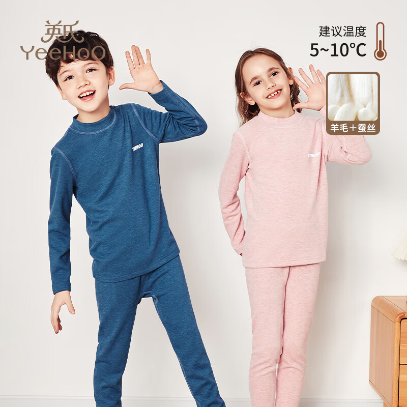 英氏(YEEHOO)新年礼物儿童蚕丝羊毛保暖内衣套装冬季加厚柔软男童女童秋衣秋裤 蓝色【男童款】 150