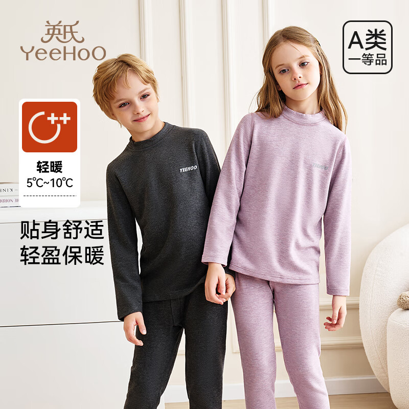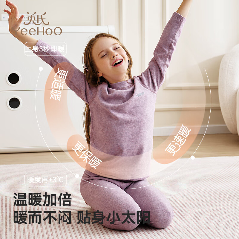 英氏(YEEHOO)新年礼物儿童蚕丝羊毛保暖内衣套装冬季加厚柔软男童女童秋衣秋裤 紫色【女童款】 150
