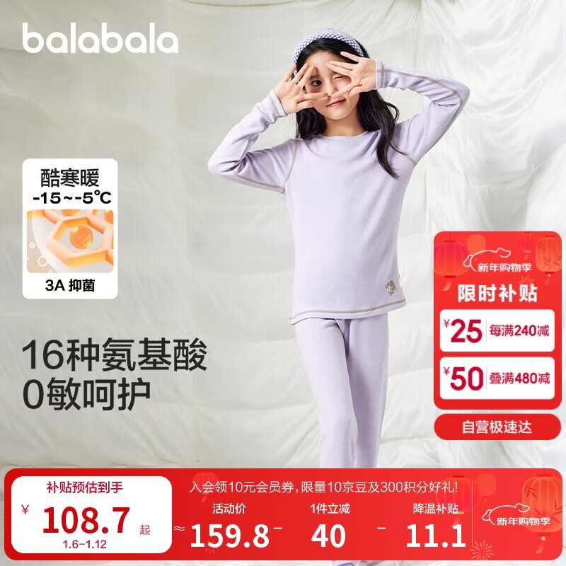 英氏(YEEHOO)新年礼物儿童蚕丝羊毛保暖内衣套装冬季加厚柔软男童女童秋衣秋裤 紫色【女童款】 140