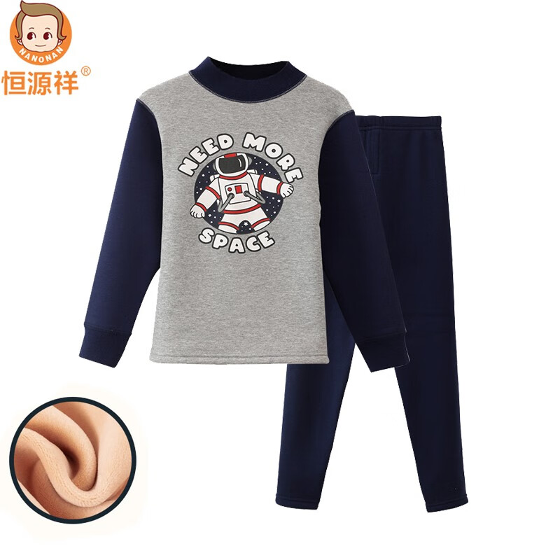 恒源祥儿童保暖内衣套装加绒加厚秋冬季男童中大童纯棉内衣宝宝外穿秋衣 中领藏青灰太空 160cm(适合身高141-150cm)