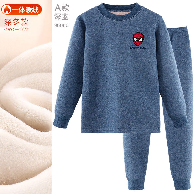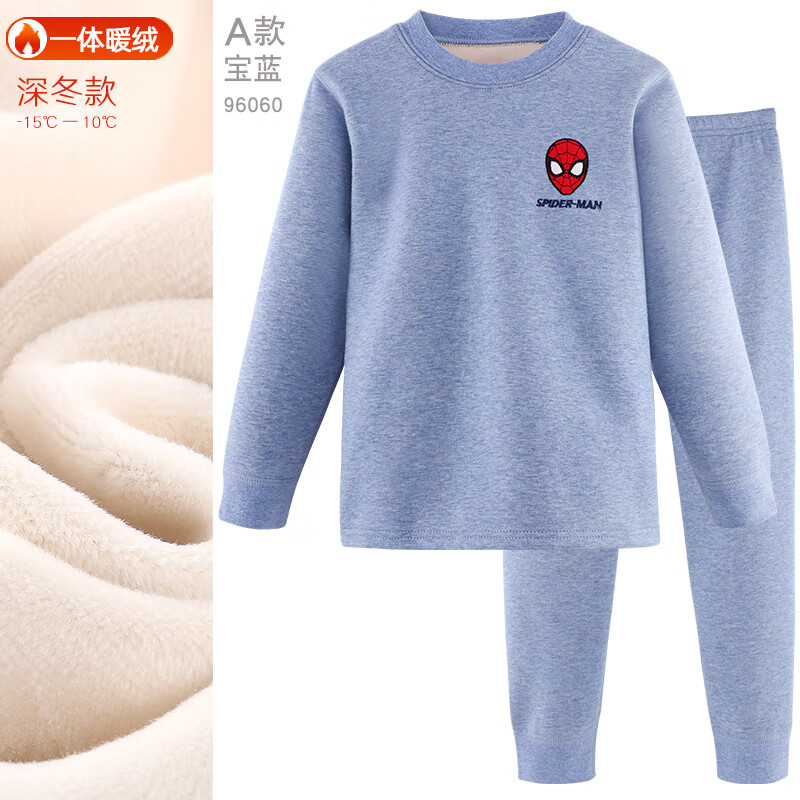 迪士尼儿童保暖内衣套装纯棉加厚加绒男童秋衣秋裤宝宝睡衣大童装 A款 【A类 加绒加厚】蜘蛛侠 宝蓝 96060 165