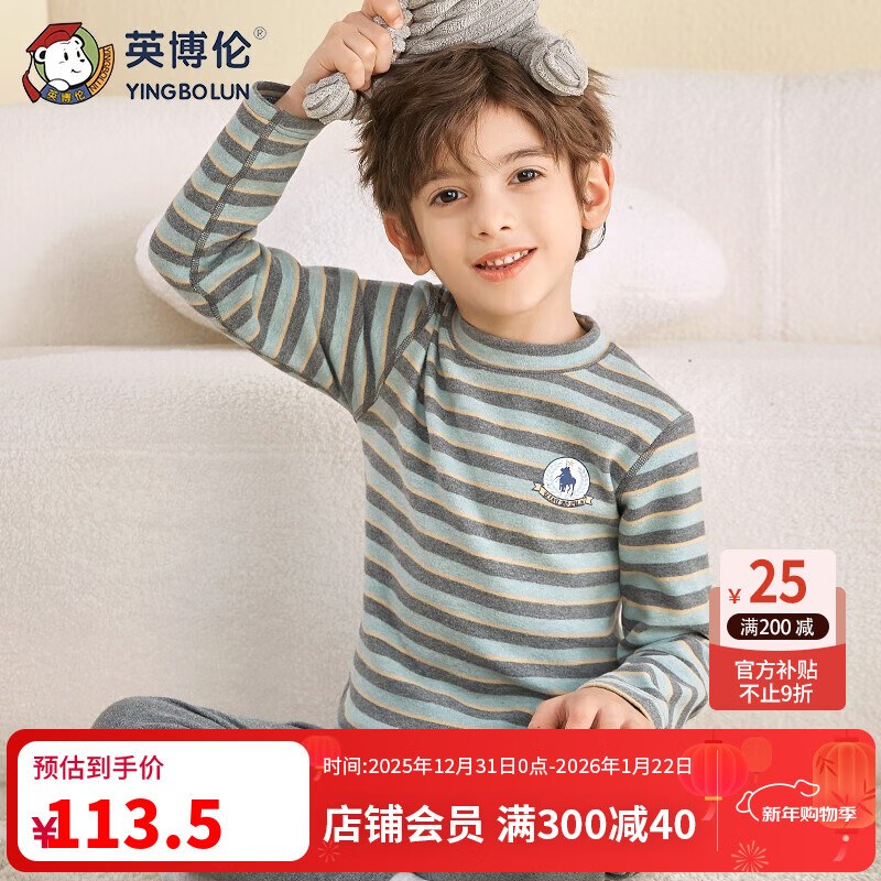 英博伦秋冬男童保暖内衣套装舒绒纯棉儿童秋衣秋裤加厚宝宝棉毛衫 85289兰灰条 140