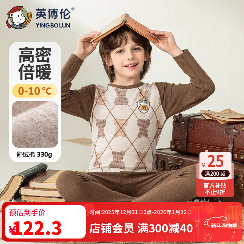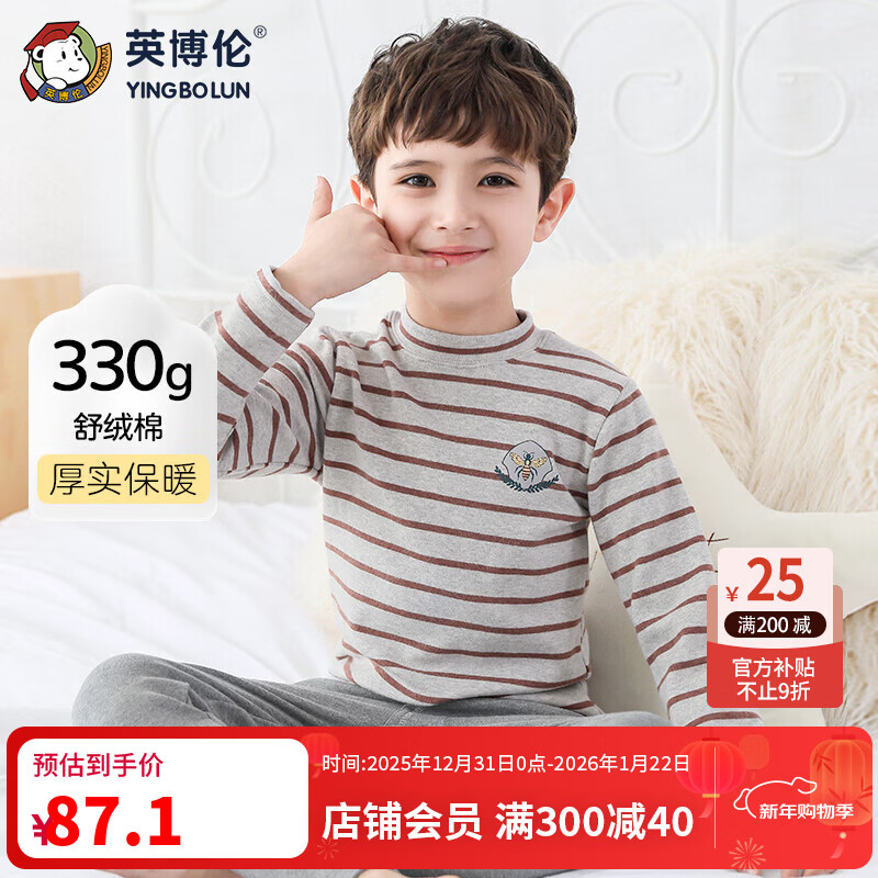 英博伦秋冬男童保暖内衣套装舒绒纯棉儿童秋衣秋裤加厚宝宝棉毛衫 85461咖啡条 140