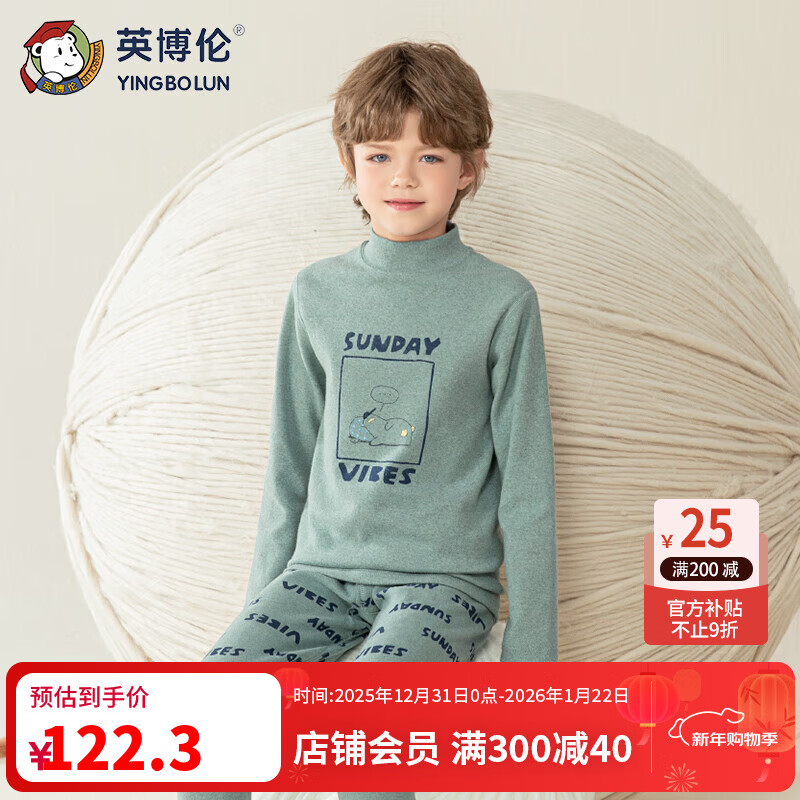 英博伦【商场同款】男童保暖加厚内衣套装冬季全纯棉儿童秋衣秋裤 81101 色纺绿 150cm