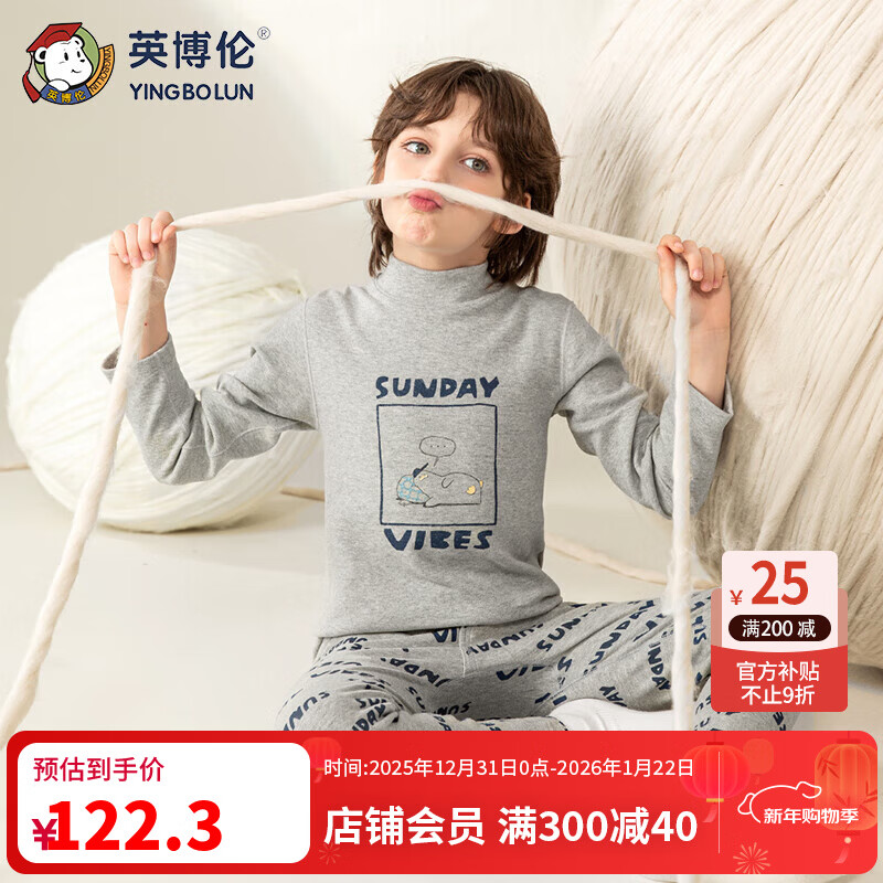英博伦【商场同款】男童保暖加厚内衣套装冬季全纯棉儿童秋衣秋裤 81101 色纺灰 140cm