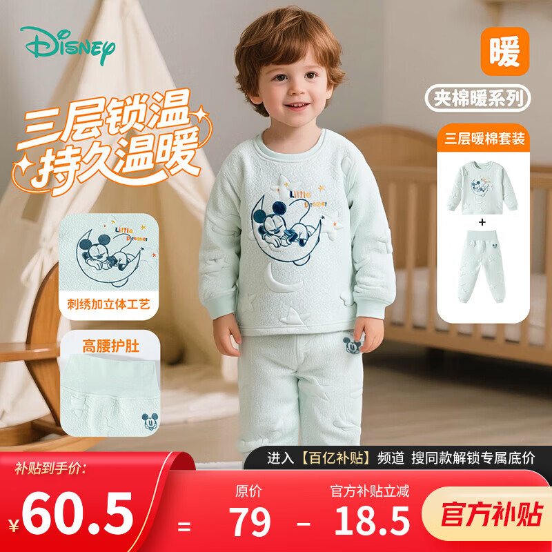 迪士尼(Disney)宝宝三层夹棉保暖内衣套装纯棉加厚款儿童秋衣秋裤男童女 浅蓝色米奇套装 80