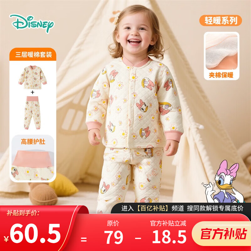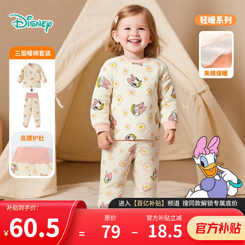 迪士尼(Disney)宝宝三层夹棉保暖内衣套装纯棉加厚款儿童秋衣秋裤男童女 按扣花朵米妮套装 80