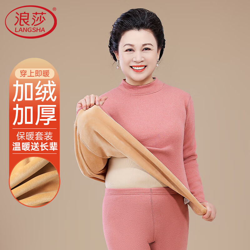 浪莎妈妈保暖内衣女士秋衣秋裤加绒加厚中老年人半高领防寒套装秋冬季