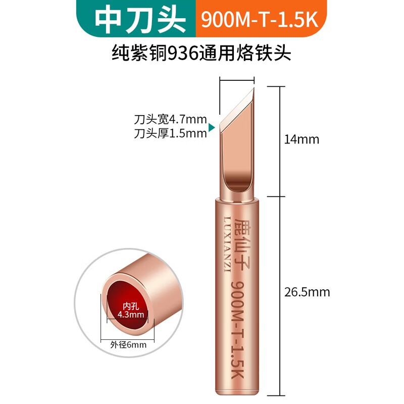 鹿仙子936纯紫铜电烙铁头 内热式恒温洛铁头尖嘴马蹄刀头焊台通用型 中刀头ZK