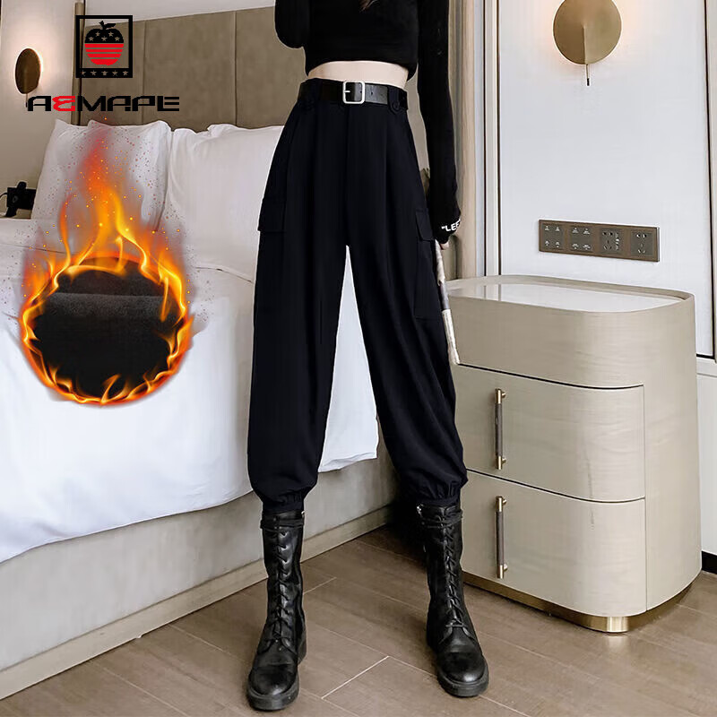 AEMAPE工装裤女2025春秋冬季新款高腰小个子裤子垂感束脚休闲裤女 黑色__单裤子_腰带 加绒 M