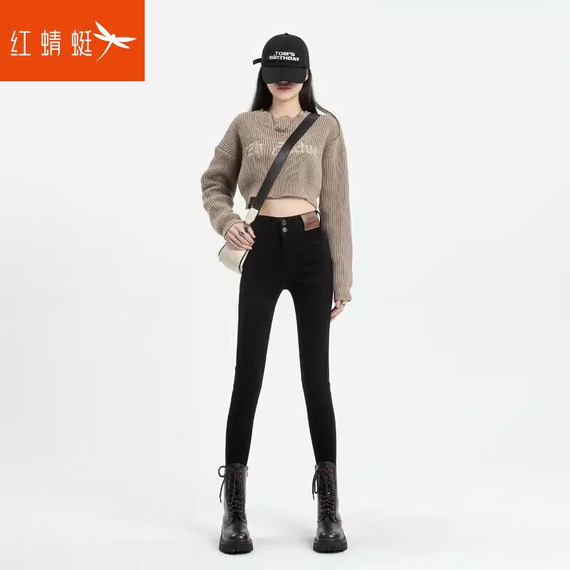 红蜻蜓牛仔裤女2025年秋季新款女装高腰修身女士铅笔裤小脚休闲长裤子女 黑色单裤 29