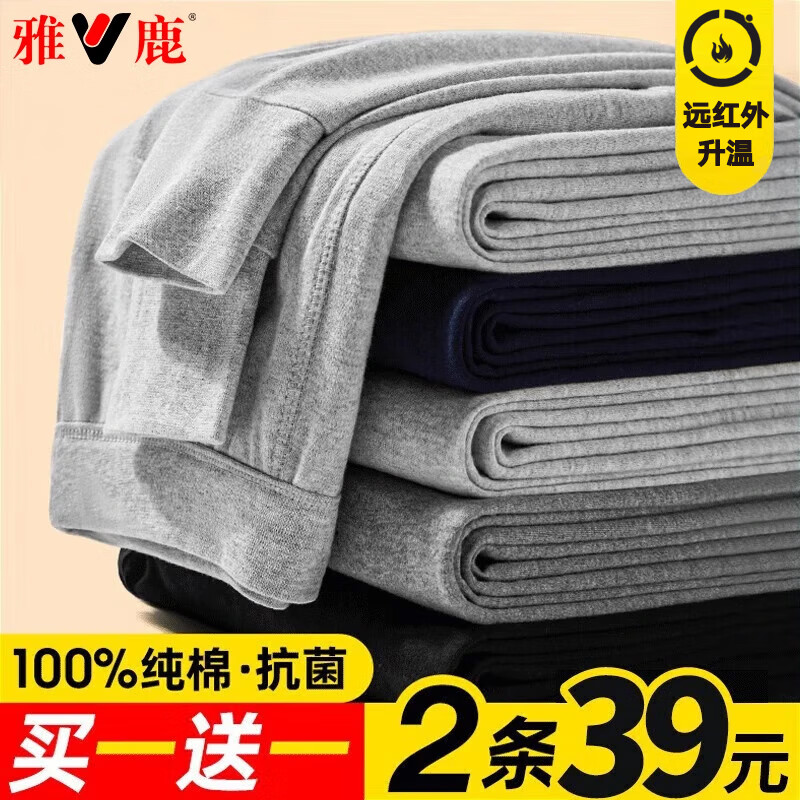 雅鹿2条100%纯棉男士秋裤男保暖衬裤冬季薄款全棉7A抗菌棉毛打底单裤