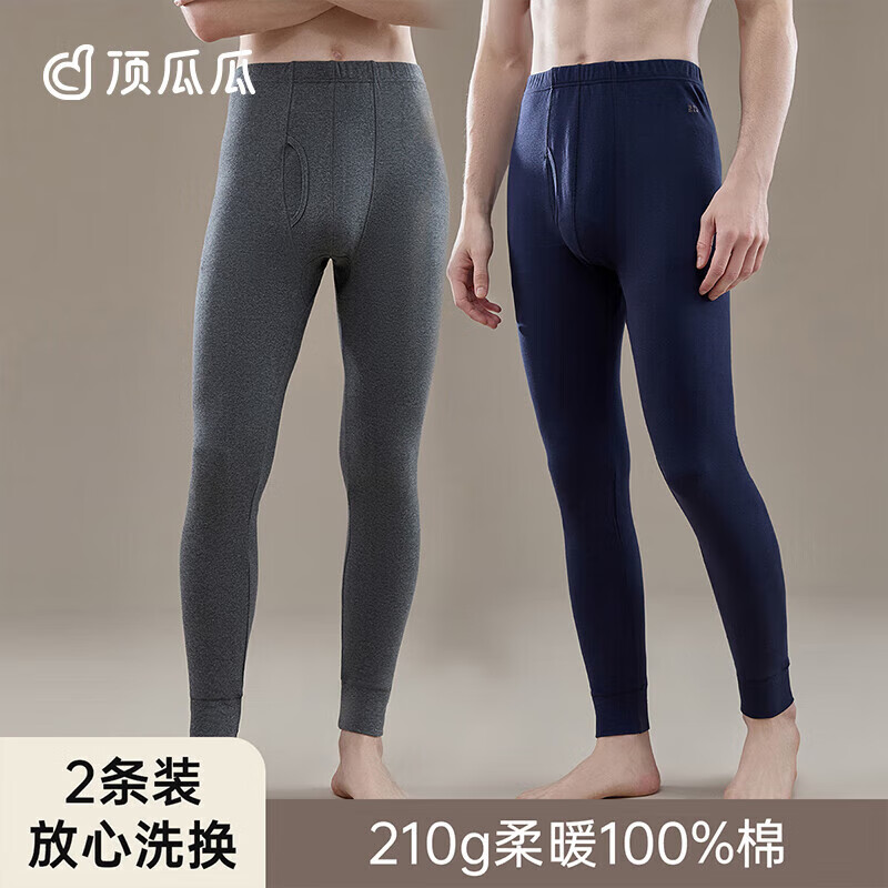 顶瓜瓜顶呱呱秋裤男纯棉薄款保暖单裤2条装棉毛裤男深麻灰浓蓝男190
