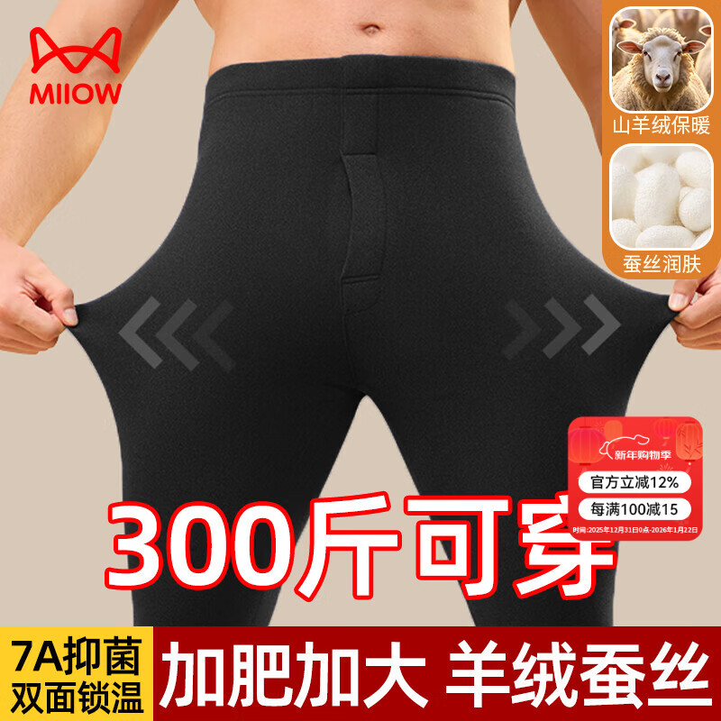 猫人大码男士秋裤男加肥加大含羊绒蚕丝衬裤薄款单裤保暖线裤冬季黑色