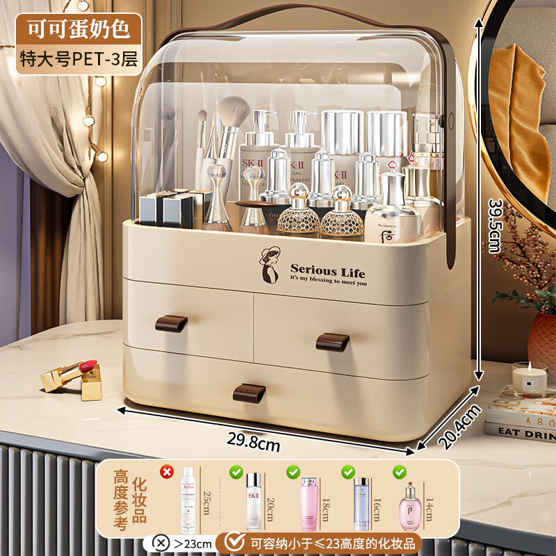 米多鱼化妆品收纳盒防尘梳妆台桌面口红护肤品整理箱七夕送礼抽屉置物架 奶油白【升级特大号】3抽屉