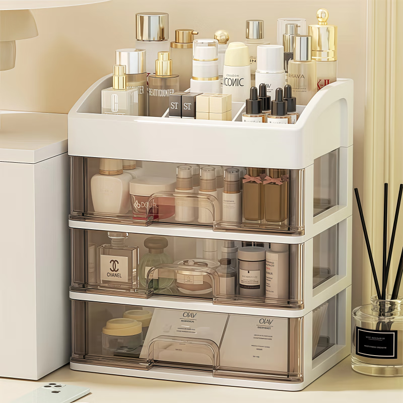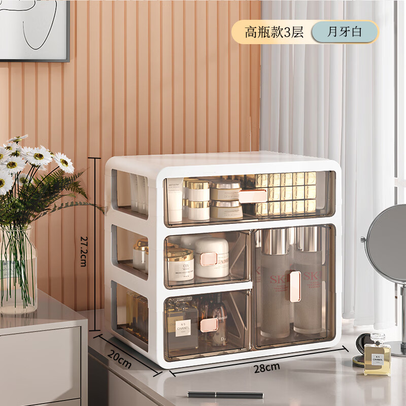 米多鱼化妆品收纳盒防尘梳妆台桌面口红护肤品整理箱七夕送礼抽屉置物架 奶油白【大号3层】3抽屉超大容量