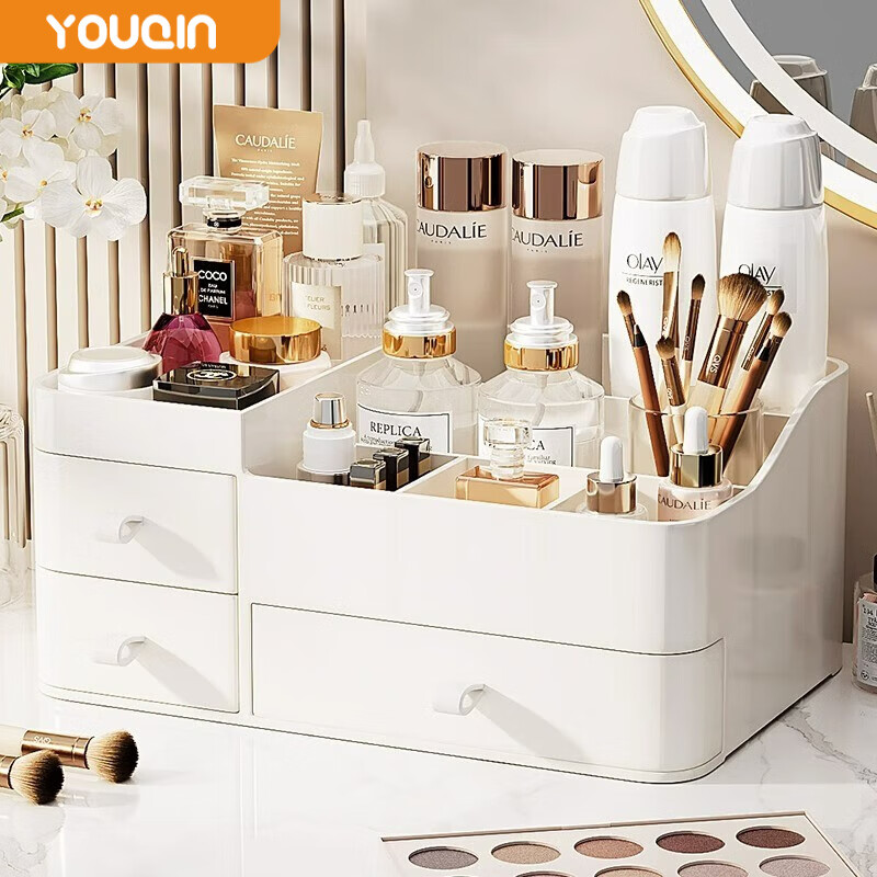 优勤(YOUQIN)化妆品收纳盒桌面梳妆台置物架抽屉护肤品口红整理箱防尘收纳盒 白色【升级款大号】三抽屉大容量