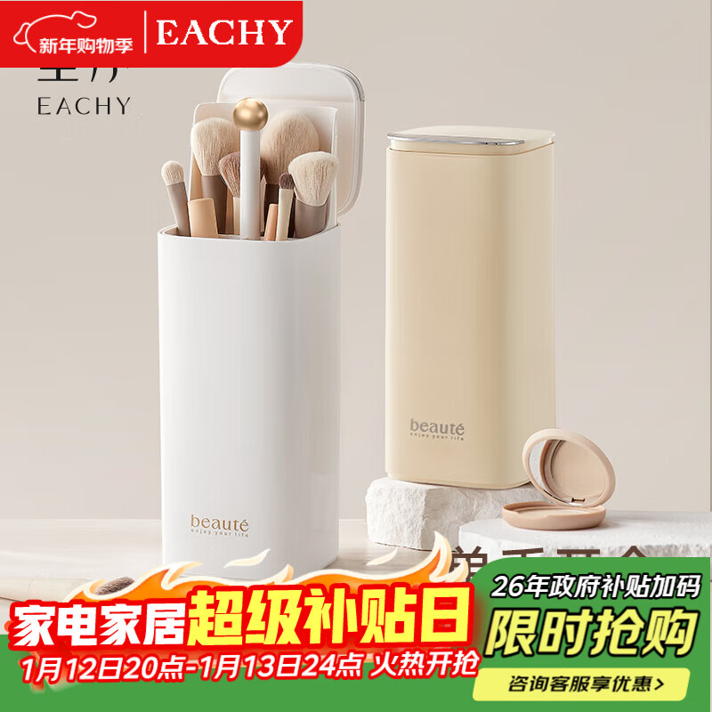 EACHY化妆刷收纳筒按压式开盖刷桶桌面收纳盒防尘带盖口红收纳-杏仁粉