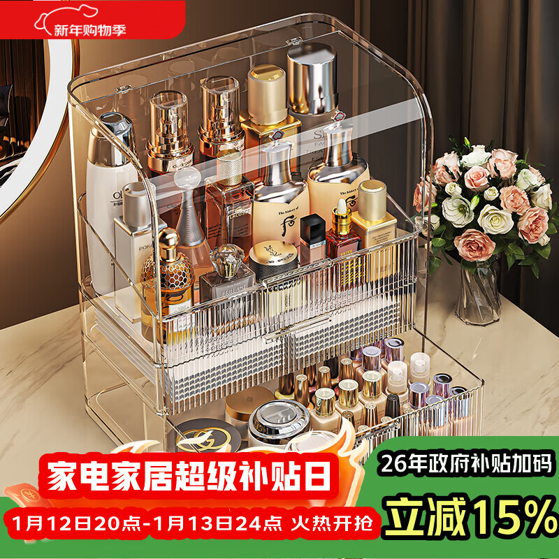 优勤(YOUQIN)化妆品收纳盒生日礼物梳妆台置物架高透亚克力轻奢抽屉防尘化妆箱 透白【超大容量防尘款】送口红盒