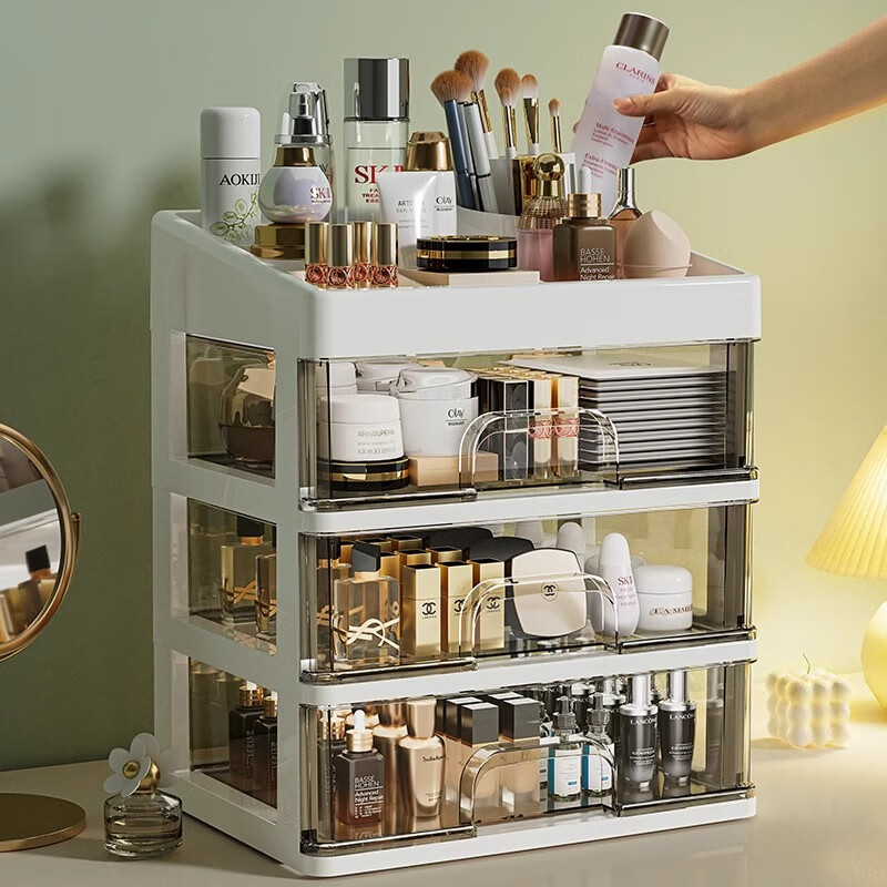 米多鱼化妆品收纳盒防尘梳妆台桌面口红护肤品整理箱七夕送礼抽屉置物架 奶油白【大号3层】3抽屉超大容量