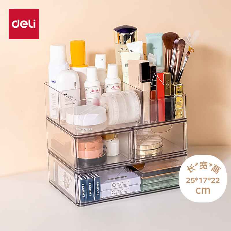 得力(deli)化妆品收纳盒套装 水乳口红桌面分格收纳 透明大容量 PJ214