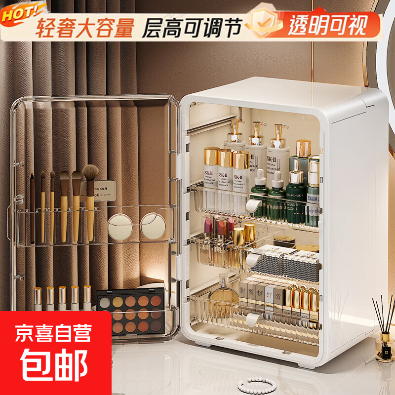 新年礼物 高级感化妆品收纳盒透明桌面护肤品口红置物架梳妆台 奶油色【加大容量】 27*24*40cm