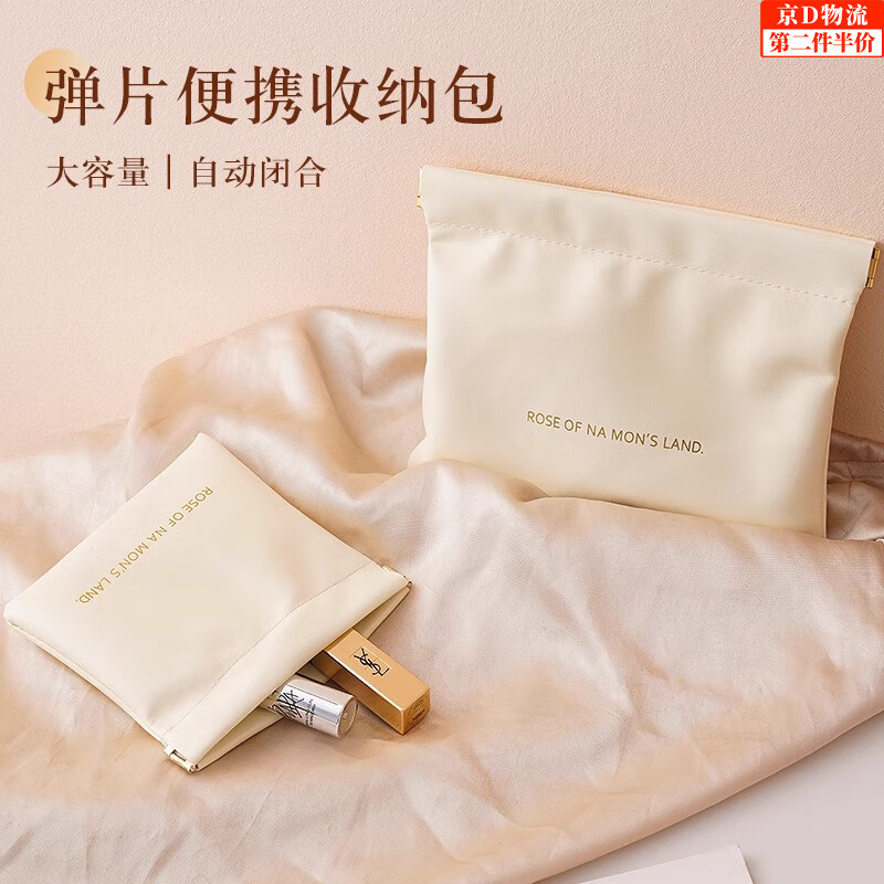 旅行便携自动闭合收纳袋PU弹片收纳包口红化妆品分类袋数据线收纳 奶油白-小号