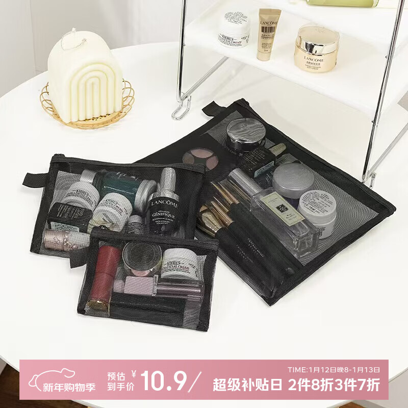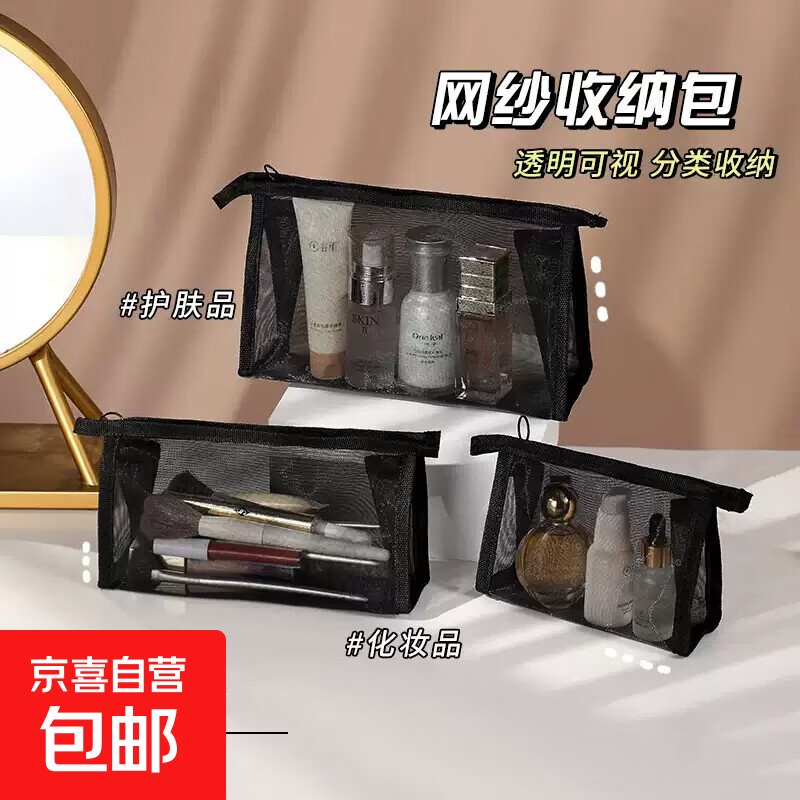 侑家良品尼龙黑色网纱包洗漱便携收纳袋口红彩妆收纳包简约旅行收纳化妆包