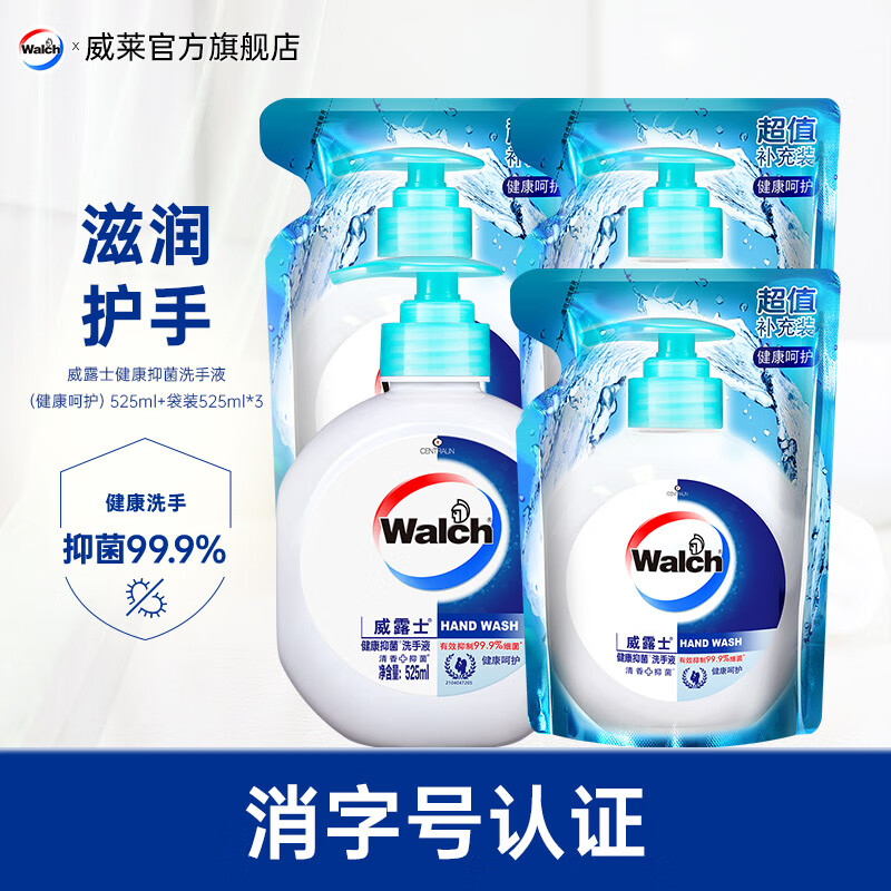 威露士(Walch)健康抑菌洗手液525ml+250ml补充装 倍护滋润儿童消毒抑菌家庭装