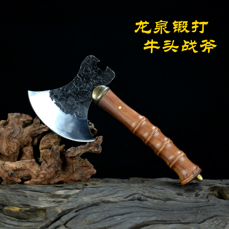 龙虎斩龙泉手工锻打砍骨斧户外生存战斧家用锋利斩骨刀剁骨刀砍树劈柴刀 牛头战斧