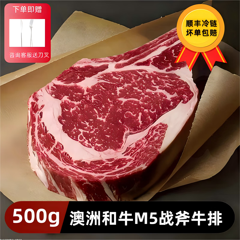 食界君澳洲和牛M5原切战斧牛排谷饲厚切牛扒健身短柄带骨眼肉 源头直发 500g默认(2公分左右)带刀叉 M5战斧牛排(厚度可定制)