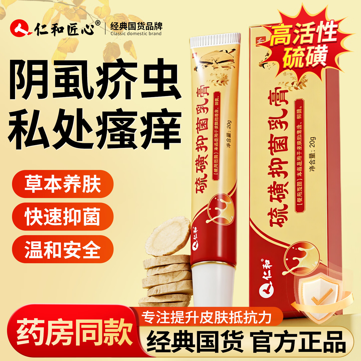 仁和匠心硫磺软膏阴虱疥虫专用抑菌膏药男女私处瘙痒疮皮肤医用级止痒乳膏